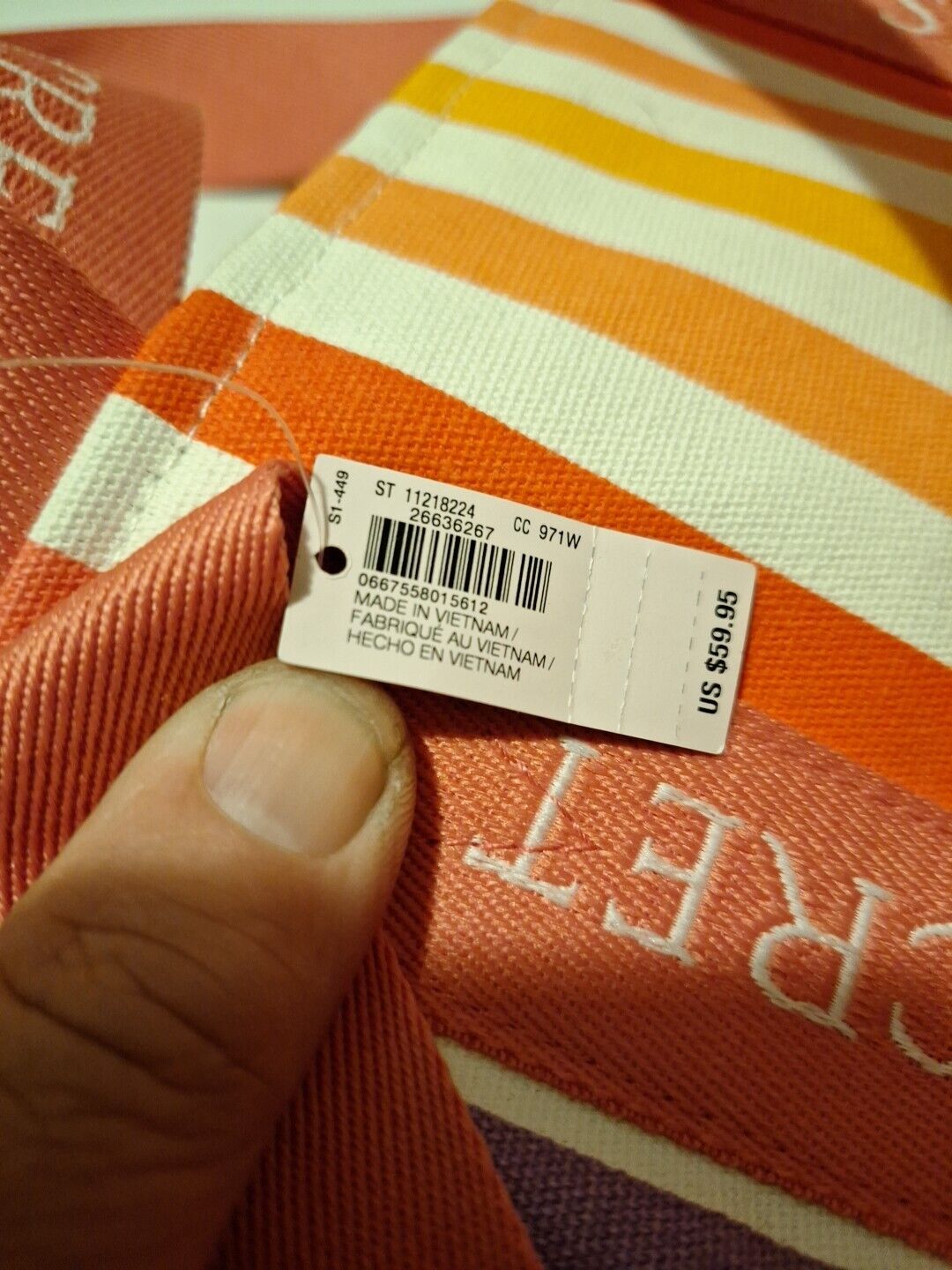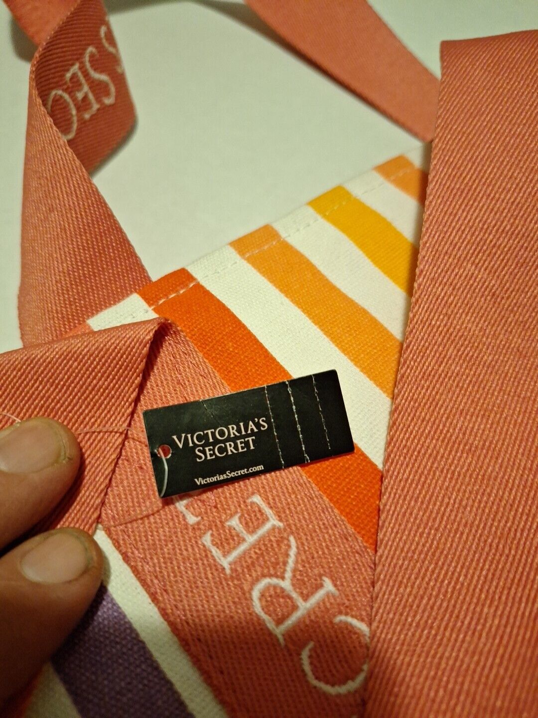 This Victoria's Secret Zip Tote is the perfect accessory for any beach or vacation occasion. The bag features a stylish multi-stripe exterior with a pink zipper and Victoria's Secret logo accents. It has double handles and a zip-around closure for easy access.